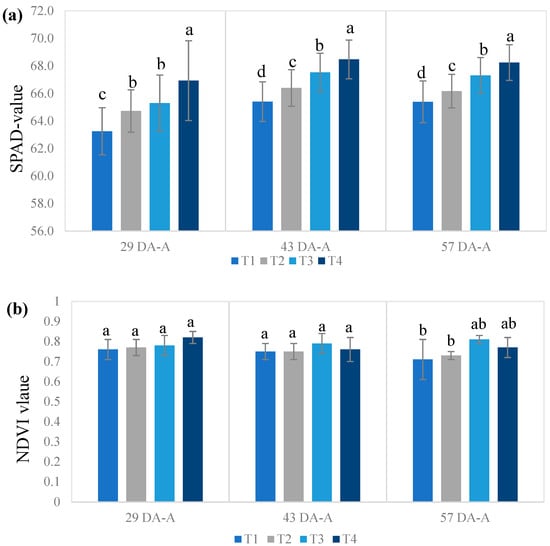 Values of SPAD (a) and NDVI (b) in leaves of Solanum lycopersicum cv. Taylor F1 plants grown in an open field and treated or not with Nurspray® as a biostimulant at different times. Treatment T1: untreated control; T2: Nurspray® application on BBCH 19–51; T3: Nurspray® application on BBCH 19–51–61; and T4: Nurspray® application on BBCH 19–23–51; DA-A: mean ± SD values were obtained from four repetitions in a randomized block experiment; different letters indicate statistically different means p < 0.05.