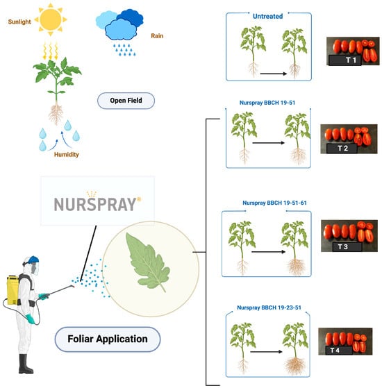 Schematic representation of the effects of Nurspray® foliar application on tomato plants at different stages (BBCH 19–51, BBCH 19–51–61, BBCH 19–23–51) under open-field conditions. The untreated control shows a smaller root system and lower fruit yield. The treatments with Nurspray® demonstrate enhanced root development and increased fruit size and quality, with T4 (BBCH 19–23–51) showing the most significant improvements in both root health and fruit yield.