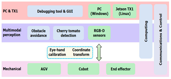 We first introduce the cherry tomato harvesting robot. The functional module diagram of the robotic system is shown in Figure 1. The main hardware modules include a customized AGV platform, a collaborative robotic arm (cobot), a customized end effector with force sensors and an RGB-D sensor, and computing, communication, and control modules. And the main software modules are obstacle avoidance, eye–hand calibration, cherry tomato detection, robotic arm and end effector control, communication and data transfer, and debugging tool and graphic user interface (GUI).