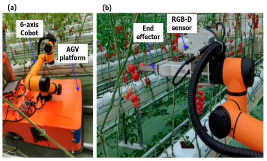 A cobot arm Aubo i5 (Aubo Robotics, Beijing, China) is mounted on top of the AGV to offer 6 degrees of manipulation freedom. It has arm reach of 88.65 cm and payload of 5 Kg. A customized end effector with two straight parallel fingers is attached to the end arm of the cobot. A force sensor is built into each finger of the end effector. The two fingers can move towards or away from each other driven by an electrical motor. A multimodal RGB-D sensor, either the Microsoft Kinect DK (Microsoft, Redmond, WA, USA) or the Litemaze TOF30, can be mounted on the cobot end arm. The Kinect DK is a developer kit, and its highest resolutions of color and depth images are 12 MP and 1 MP, respectively. The total weight of the end effector, RGB-D sensor, and the installation parts, illustrated in Figure 2b, is around 3 Kg, leaving sufficient payload capacity for cherry tomato picking. Two-arm solutions have been used to imitate humans for fruit picking [27], with more complex systems at a much higher cost. The embedded computing platform for perception and robotic control is the Nvidia Jetson TX1 (Nvidia, Santa Clara, CA, USA). A separate personal computer (PC) with Intel i7 CPU and 16 GB of RAM (Lenovo, Beijing, China) is used for development and hosting the user interface.