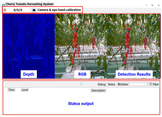 The main software modules are obstacle avoidance, cherry tomato detection, robotic arm and end effector control, communication and data transfer, and debugging tool and graphic user interface (GUI). The algorithms involved in the obstacle avoidance, eye–hand calibration, and cherry tomato detection will be discussed in detail later. The debugging and GUI are shown in Figure 3. System parameters can be configured via the settings interface. The communications between the PC, TX1, and cobot are by TCP/IP protocol. And the TX1 communicates with the RGB-D sensor by USB.