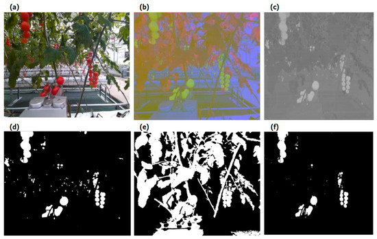 Initial cherry tomato ROI segmentation. (a) RGB image. (b) Image in Lab space. (c) Single channel in the Lab space. (d) Binary mask from all color channels. (e) Binary mask from the depth channel. (f) Initial cherry tomato ROIs.