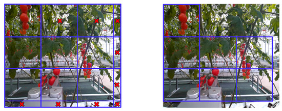 where and are the row and column sizes of the patch. When is less than the set threshold (based on the image size of the cherry tomatoes in the dataset, this study set the threshold to 10), there are no cherry tomatoes in the patch, and it is discarded. The sequentially cropped image and the filtered cropped image are shown in Figure 5.