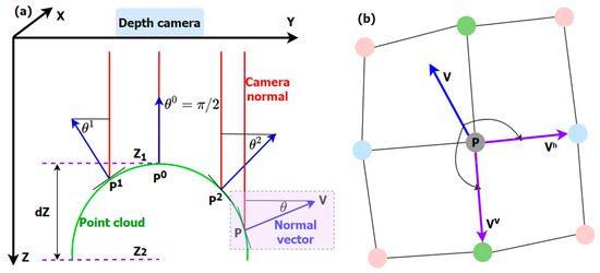 Illustration of the normal vector angles of a point cloud. (a) Normal vector angles. A cherry tomato is a small spherical object, the depth range () is only a tiny fraction of its distance to the camera (Z1). (b) A local point cloud neighborhood and its normal vector (depiction of the purple rectangular area in (a)). Each colored circle represents a point in the local neighborhood.