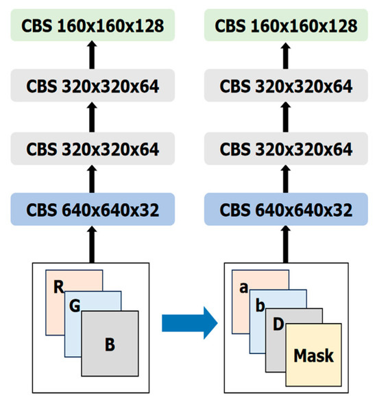 - Replacing the color image input with a multimodal image input. Most of the object detection models, including YOLOv7, use color image input. In some methods using RGB-D input, the color image is first sent into the model to obtain the preliminary results and combined with the depth map for further processing, which struggles to make full use of the depth information. Hybrid RGB-D DNNs have been proposed to better utilize both color and depth information [34,35,36]. But they usually introduce significant complexity. For simplicity, we adjust the network structure of the input of the YOLOv7-tiny and add the depth map as a separate channel to the color channels in Lab space to feed into the network. As shown in Figure 8, an RGB image is replaced by a 4-channel image by adding the mask map described above.