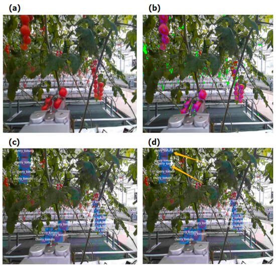 Cherry tomato detection by the YOLOv7-tiny and YOLOv7-tiny-CTD. (a) RGB image. (b) Point cloud normal vector angles added to (a), green areas indicate small, far away, or partially occluded cherry tomatoes, and purple areas large or close ones. (c) Detection output from the YOLOv7-tiny. (d) Detection output from the YOLOv7-tiny-CTD. The two orange arrows point to cherry tomatoes that are detected by the YOLOv7-tiny-CTD but missed by the YOLOv7-tiny.