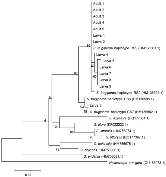 The CO I segment was used to confirm the species identification by comparing it with the barcode sequences in GenBank. Based on BLAST analyses of the sequences obtained from the NCBI GenBank database and phylogenetic tree (Figure 1), the larvae and adults collected from the paddy field in both Yangjiang City and Taishan City were identified as S. frugiperda, as indicated by 99–100% similarity in sequence data and coverage.