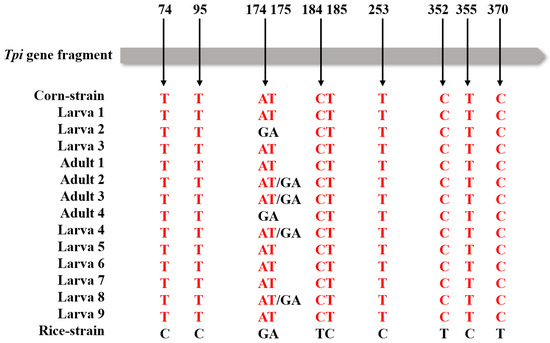 Haplotype analysis based on Tpi gene fragments; arrows indicate corn or rice strain-specific polymorphic loci. Adults 1–5 indicate the samples of adult moths collected in Taishan City. Larva 1–3 indicate the samples of larvae collected in Taishan City and Larva 4–9 indicate the samples of larvae collected in Yangjiang City.
