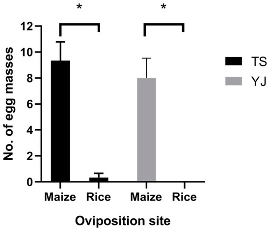 Oviposition preference of FAW females collected from rice fields in Taishan City (TS) and Yangjiang City (YJ) in Guangdong Province. Values = mean ± SE. *, p < 0.05. n = 3.