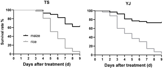 The Mantel-Cox test showed significant differences between the cumulative survival curves of FAW larvae feeding on maize and those feeding on rice leaves (Figure 5, TS: df = 1, χ2 = 70.47, p < 0.0001; YJ: df = 1, χ2 = 71.81, p < 0.0001). In TS colony, seventy FAW larvae were fed rice leaves and their survival rate decreased to 0% at 9 days after hatching. At 9 days, the survival rate of the larvae feeding on maize leaves was 62.3%. In YJ colony, the survival rate of the larvae at 9 days after hatching were 2.86% and 72.86% on rice and maize leaves, respectively.