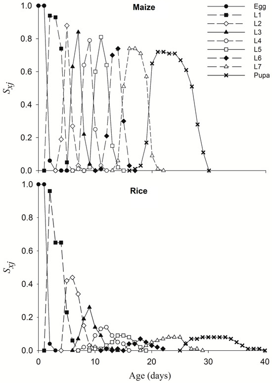 Age-stage survival rate (sxj) of FAWs fed maize or rice leaves.