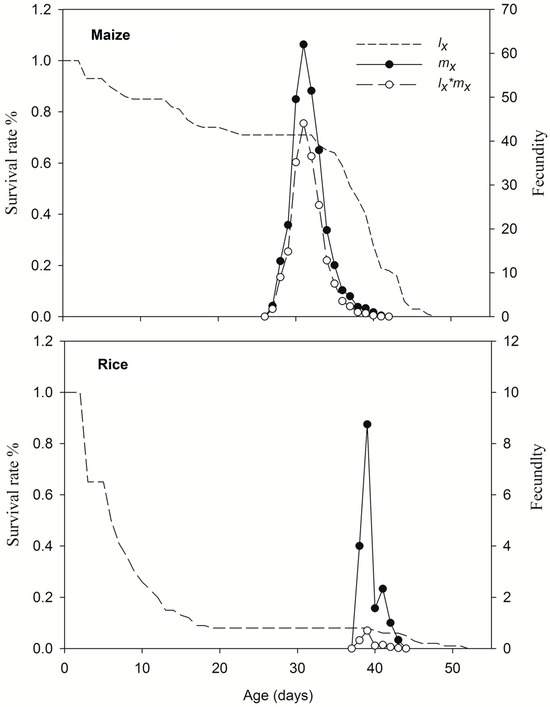Survival rate (lx), age-specific fecundity (mx) and age-stage specific reproduction (lx * mx) of FAWs fed maize or rice leaves.
