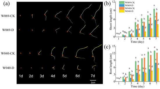 Figure 1. Drought stress severely delayed germination. No significant differences in germination performance were observed between W069 and W040 under control conditions. However, seed germination was severely restricted under drought stress conditions. After 7 days of drought stress treatment, the shoot and root lengths of W069 were decreased by 40.07% and 39.80%, respectively, compared to the control, while the shoot and root lengths of W040 were decreased by 48.80% and 53.70%. Therefore, there were significant differences in the tolerance of W069 and W040 to drought stress after 7 days of treatment.