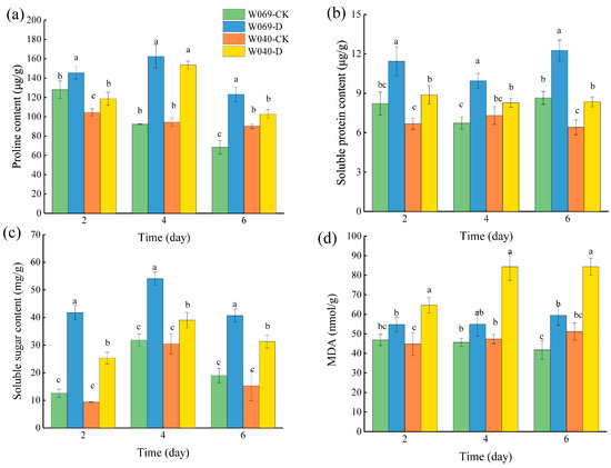 Figure 2a–c. Compared with the control, the proline, soluble protein, and soluble sugar levels were significantly increased during seed germination under drought stress, and the increase was substantially higher in W069. For example, under drought stress, the soluble sugar content in W069 was 3.33-fold, 1.70-fold, and 2.14-fold higher on day 2, day 4, and day 6 of germination compared to the control, respectively. Notably, the soluble sugar content in W040 was 2.71-fold, 1.28-fold, and 2.05-fold higher compared to the control, respectively. The MDA levels of W069 and W040 showed a significant trend in increase under drought stress. The MDA content of W069 was 1.22-fold, 1.34-fold, and 1.15-fold higher than that of the control on days 2, 4, and 6 of exposure to drought stress. The MDA content of W040 was 1.29-fold, 1.76-fold, and 1.45-fold higher compared to the control, respectively (