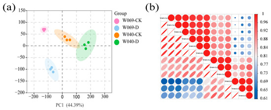 Figure 3, the control and treatment samples exhibited a greater spatial separation, while the samples from different biological replicates within the same group showed a closer and more concentrated distribution. Pearson’s correlation analysis showed that the correlation coefficient within replicates was higher, i.e., close to one, and the correlation coefficient between the treatments was lower, indicating that there were differences between the treatments. This indicates that the transcriptome sequencing data of all the samples were of good quality. The data were reproducible and reliable, and could meet the requirements of the subsequent bioinformatics analyses.