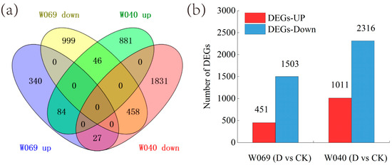 Figure 4a,b. More DEGs were observed at the transcriptomic level in W040 than W069, indicating that W040 was more susceptible to drought stress. Of the unregulated DEGs, there were 84 DEGs in common between both genotypes, with 367 and 927 DEGs up-regulated in W069 and W040, respectively. There were 458 DEGs down-regulated in both genotypes under drought stress, with 1455 and 1858 DEGs down-regulated in W069 and W040, respectively. In addition, 27 DEGs were up-regulated in W069 but down-regulated in W040, whereas 46 DEGs were up-regulated in W040 but down-regulated in W069. Of these DEGs, we identified a total of 615 shared differential genes in W069 and W040 in response to drought stress. In total, 111 and 130 DEGs were up-regulated in W069 and W040, respectively. Meanwhile, 504 and 485 DEGs were down-regulated in W069 and W040, respectively, as seen in