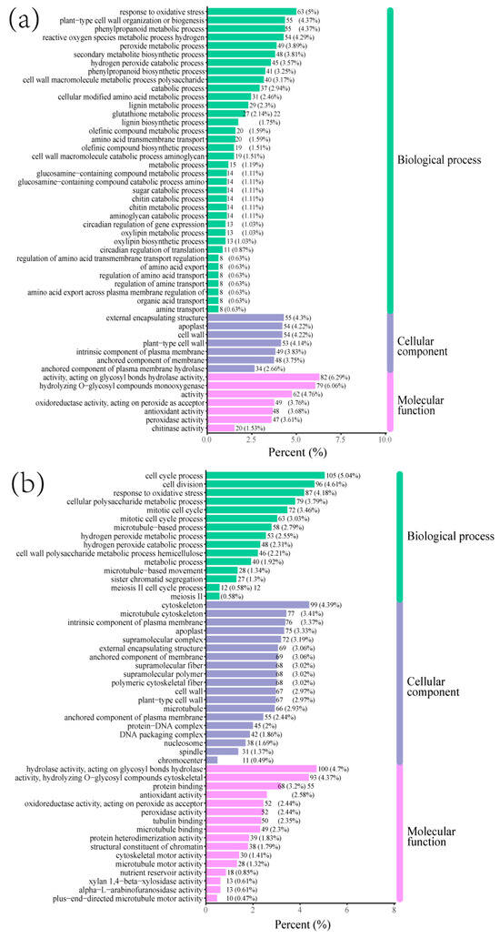Figure 5a,b). After 24 h of drought stress exposure, the DEGs of W069 were significantly enriched in the biological process of phenylpropanoid metabolism, with a total of 55 related genes, followed by the metabolic process for ROS, involving a total of 54 related genes. In addition, the genes for the hydrogen peroxide metabolic, hydrogen peroxide catabolic, and phenylpropanoid biosynthetic processes were also found to be involved. DEGs were significantly enriched in cellular components related to membranes; more than 300 genes, mainly including the external encapsulating structure, apoplast, cell wall, and intrinsic component of plasma membrane, were included among these DEGs. During the molecular process, the DEGs were mainly enriched in hydrolase activity, oxidoreductase activity, antioxidant activity, peroxidase activity, and chitinase activity, indicating that these genes play an important role in the drought response mechanism of W069. Simultaneously, we also conducted the GO enrichment analyses of the 615 common differential genes, as detailed in