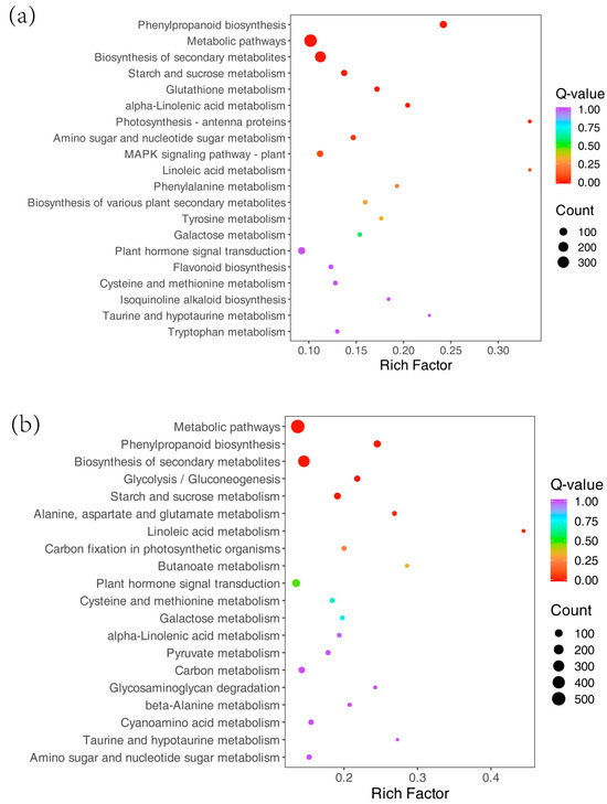 Figure 6a,b. Eight pathways, including those for phenylpropanoid biosynthesis, metabolic pathways, biosynthesis of secondary metabolites, starch and sucrose metabolism, α-linolenic acid metabolism, linoleic acid metabolism, phytohormone signaling, and taurine and hypotaurine metabolism, were commonly enriched in the two cultivars. Sorghum cultivars share common pathways for drought tolerance, especially for energy metabolism. In the W069 enrichment pathway, 76 genes were significantly enriched during the biosynthesis of secondary metabolites of phenylpropanes, 46 genes were significantly enriched during starch and sucrose metabolism, and 27 genes were enriched during glutathione metabolism, among others (