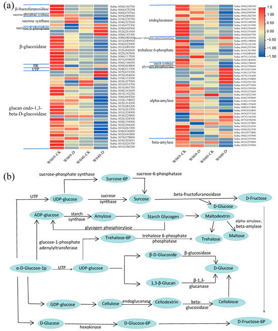 Several DEGs, including those expressing fructose, sucrose, glucose, and trehalose, were significantly enriched during the synthesis and hydrolysis of sucrose. Sucrose synthase plays an important role in sucrose metabolism and two genes were significantly up-regulated; beta-fructofuranosidase was down-regulated; and the most enriched gene was glucan endo-1,3-beta-D-glucosidase, with significantly higher expression in the drought-resistant cultivars than in the drought-sensitive cultivars. As observed for sucrose, the genes related to trehalose 6-phosphate synthase metabolism were involved in the plant response to drought stress, and the six genes enriched to trehalose 6-phosphate synthase. The expression of the six genes enriched to trehalose 6-phosphate synthase was higher in the control as well as in the drought-resistant cultivar under drought stress, and the expression of the Sobic.007G124200.v3.2 gene was significantly increased in the drought-resistant cultivar W069 after drought stress.