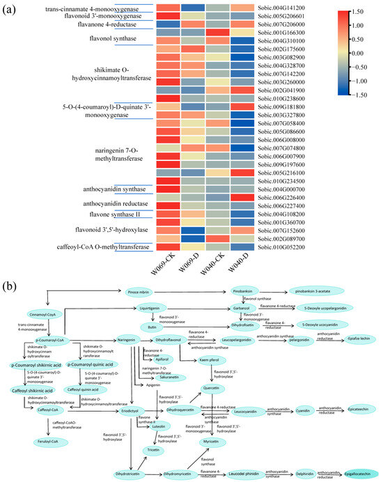 Figure 9). The DEGs for flavonoid biosynthesis included 12 key enzymes, including those expressing flavonoid 3′-monooxygenase, flavanone 4-reductase, anthocyanidin reductase, and flavonoid 3′-monooxygenase. In this study, after exposure to drought stress, the levels of most DEGs associated with flavonoid production were significantly higher in the drought-resistant cultivars than in the susceptible cultivars.