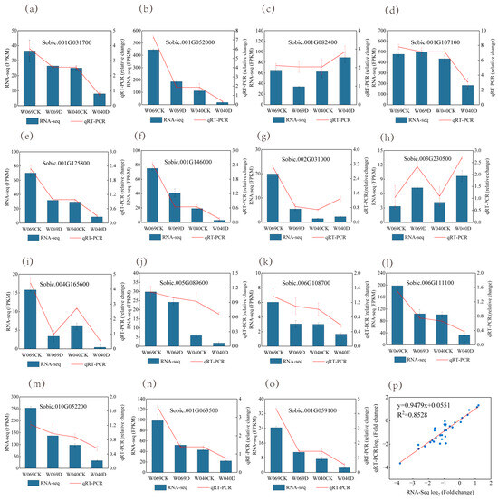 A total of 12 samples were collected from the two sorghum cultivars (W069 and W040) and germinated for 24 h under normal (PEG 6000 concentration = 0 g/L) and drought stress (PEG 6000 concentration = 150 g/L) conditions, each with three biological replicates for total RNA extraction. The samples were extracted using ethanol precipitation and CTAB-PBIOZOL. After successful extraction, RNA was dissolved by adding 50 μL of DEPC-treated water. The RNA quality and integrity were assessed using a Nanodrop 2000 spectrophotometer (Thermo Fisher Scientific, Wilmington, DE, USA), a Qubit 2.0 fluorometer (Life Technologies, Carlsbad, CA, USA), and an Agilent 2100 bioanalyzer (Agilent Technologies, Santa Clara, CA, USA). The mRNA was isolated from purified total RNA using poly(T) oligo-nucleotide-attached magnetic beads and then cleaved into short fragments used as templates for double-stranded cDNA synthesis. First-strand cDNAs were synthesized using reverse transcription with random hexamer primers. Second-strand cDNAs were generated concurrently with end repair and dA-tailing. Sequencing adapters were ligated, followed by purification and fragment size selection to create a library with 250–350 bp inserts. After quality checks, the libraries were pooled and sequenced on an Illumina platform to produce 150 bp paired-end reads. The sequencing process involves simultaneous synthesis and sequencing, where fluorescently labeled dNTPs are incorporated into extending complementary strands, emitting fluorescence detected by the sequencer and converted into sequence information by computer software. Library construction and RNA sequencing analysis (RNA-seq) were performed at Metware Co., Ltd., Wuhan, China. Differentially expressed genes (DEGs) in the RNA-seq data between the drought treatment and control groups were identified using a DEGseq analysis. The DEGs were screened further based on whether |log2 Fold Change| >= 1 and FDR < 0.05.