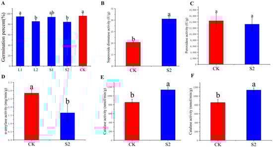 The germination percentage of the L2 and S2 treatments decreased by 11.00% and 12.02% compared to that of the CK (Figure 1A). The germination percentage of the L1 and S1 treatments did not differ significantly from that of the CK.