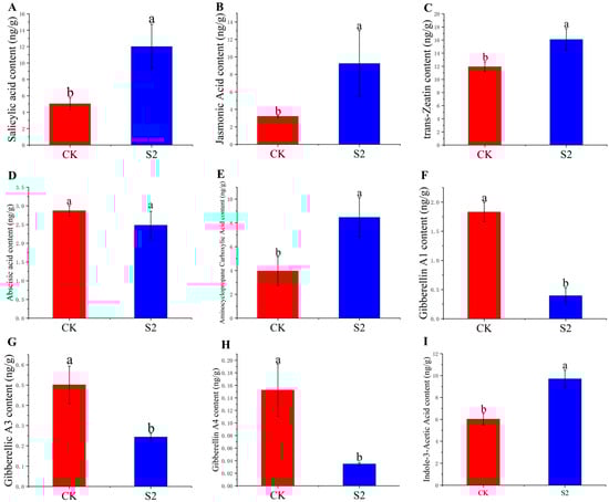 Phytohormone contents in wheat seeds treated with rice straw extracts. (A) Salicylic acid, (B) jasmonic acid, (C) trans-zeatin, (D) abscisic acid, (E) aminocyclopropane carboxylic acid, (F) gibberellin A1, (G) gibberellin A3, (H) gibberellin A4, (I) indole-3-acetic acid. S2, wheat seeds treated with 60 g L−1 of rice stem extracts; CK, wheat seeds treated with sterile water. Different lowercase letters on each bar indicate significant differences (p < 0.05, Fisher’s least significant difference).