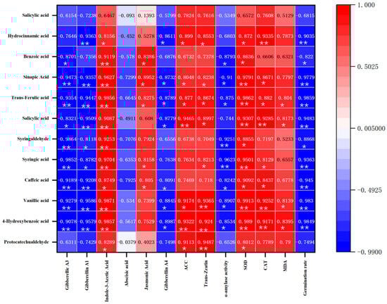 Allelochemical contents were negatively correlated with germination percentage, α-amylase activity, and gibberellin A1, A3, and A4 contents (Figure 3). Among the allelochemicals, the contents of sinapic acid, trans-ferulic acid, syringic acid, caffeic acid, vanillic acid, and 4-hydroxybenzoic acid were significantly negatively correlated with germination percentage, α-amylase activity, and gibberellin A1 and A3 contents. Allelochemical contents were positively correlated with SOD and CAT activities and MDA, indole-3-acetic acid, jasmonic acid, and trans-zeatin contents.