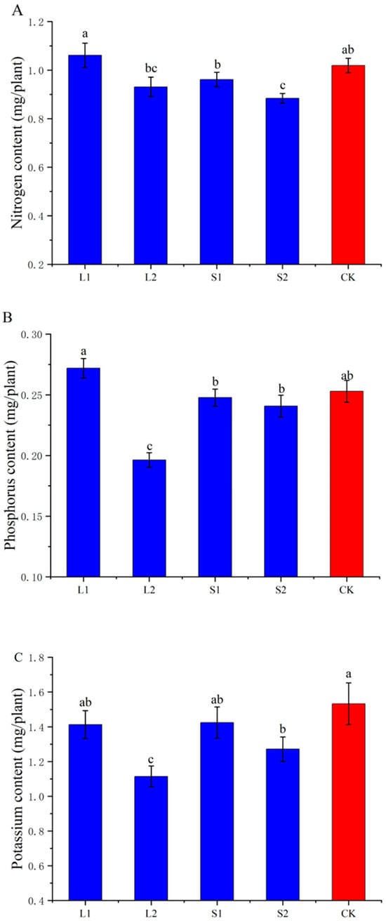 The nitrogen content of wheat seedlings in the S2 treatment decreased by 8.02% to 13.26% compared to that of L1, S1, and CK (Figure 4A). The phosphorus content of wheat seedlings in the S2 treatment decreased by 27.78% compared to that of L1 (Figure 4B). The potassium content of wheat seedlings in the S2 treatment decreased by 17.01% compared to that of the CK (Figure 4C). The nitrogen, phosphorus, and potassium contents of wheat seedlings in the L2 treatment were lower than those of L1 and the CK (Figure 4). The nitrogen, phosphorus, and potassium contents of the L1 and S1 treatments did not significantly differ from those of the CK.