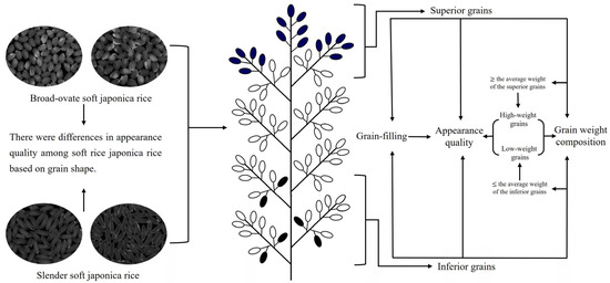 Here is a schematic diagram that visually represents the differences in appearance quality of soft japonica rice with different grain shapes. Additionally, it illustrates the main analytical approach of this study (Figure 1).