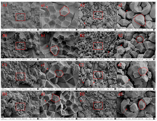 The structure of the endosperm of superior and inferior grains of soft japonica rice with different grain shapes. (A1,a1): Nanjing 5718-superior grains; (A2,a2): Nanjing 5718-inferior grains; (B1,b1): Nanjing 9108-superior grains; (B2,b2): Nanjing 9108-inferior grains; (C1,c1): Shangshida 19-superior grains; (C2,c2): Shangshida 19-inferior grains; (D1,d1): Jiahe 218-superior grains; (D2,d2): Jiahe 218-inferior grains.