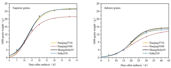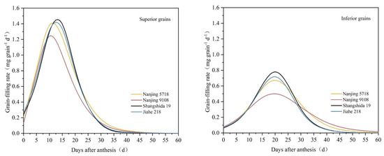 Spikes with consistent growth and simultaneous flowering were marked at the onset of the flowering stage for each rice variety. Spikes samples were collected at 5, 10, 15, 20, 30, 40 days post-flowering, as well as at maturity. These samples were then separated into superior grains (SG), which are located at the apical of the primary branches, and inferior grains (IG), which are located on proximal secondary branches. The superior and inferior grains were deactivated by heating at 105 °C for 0.5 h and dried at 80 °C until they reached a constant weight, following the removal of unfertilized empty grains. After hulling the grains, they were weighed, and the average weight was calculated to determine the dynamics of grain weight increase. Following the method of Zhu et al. [36], Richards’s equation was employed to fit the grain-filling process. Grain-filling parameters and rates were calculated, and the grain-filling characteristics were analyzed.