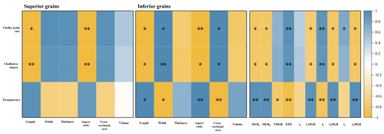 An analysis of the correlation between grain shape traits and chalkiness traits, as well as transparency in superior and inferior grains of soft japonica rice with different grain shapes follows. In superior grains, the chalky grain rate had a significant negative correlation with length and a highly significant negative correlation with the aspect ratio (Figure 5). The degree of chalkiness was found to have a highly significant negative correlation with both grain length and aspect ratio. Transparency, however, showed no significant correlation with any of the grain shape traits. For inferior grains, the chalky grain rate had a significant negative correlation with length, a significant positive correlation with width and cross-sectional area, and a highly significant negative correlation with the aspect ratio. The degree of chalkiness displayed a significant negative correlation with grain length and aspect ratio, a highly significant positive correlation with width, and a significant positive correlation with cross-sectional area. Transparency in inferior grains had a significant positive correlation with length, a significant negative correlation with width, a highly significant positive correlation with the aspect ratio, and a highly significant negative correlation with cross-sectional area.