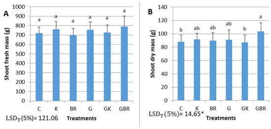 Effects of biostimulants and glyphosate on GR maize seedlings shoot fresh (A) and dry (B) mass in the 2019 growing season; different letters within the same column indicate significant differences between means after Tukey’s protected LSD test at p = 0.05, * = p < 0.05.