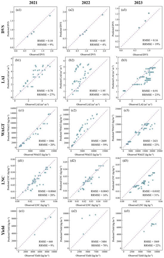Simulation results of rice state variables for three years by ORYZA2000 model. (a1–a3) DVS simulation results for 2021, 2022, and 2023; (b1–b3) LAI simulation results for 2021, 2022, and 2023; (c1–c3) WAGT simulation results for 2021, 2022, and 2023; (d1–d3) LNC simulation results for 2021, 2022, and 2023; and (e1–e3) Yield simulation results for 2021, 2022, and 2023.