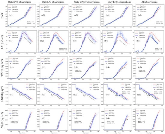 In this section, the OSS was utilized to assess the performance of the ORYZA-EnKF data assimilation system. To investigate the influence of different observation variables on crop model simulations, this study assimilated all observations as well as individual DVS, LAI, WAGT, and LNC observations into the ORYZA2000 model. The results are presented in Figure 5. It can be found that the simulation accuracy of DVS improved after taking DVS observations into account, but the results for other state variables showed no significant enhancement. Assimilating the LAI improved the simulation results of many other state variables, but had a limited impact on the updating of rice LNC (Figure 5(d2)), which suggested that the LAI alone is insufficient to capture the nitrogen dynamics. The simulations of WAGT and yield were also improved when WAGT observations were assimilated into the ORYZA2000 model, mainly because above-ground biomass is the sum of the mass of stems, leaves, and grains of rice. This could be more apparent in crop models that calculate yield using the harvest index [31]. But, the improvements in overall simulation accuracy by taking WAGT observations into account were less effective than the LAI, which is similar to the findings of Zhang et al. [65]. In the ORYZA2000 model, rice yield is not calculated using the harvest index directly but is instead determined through more complex processes of dry matter accumulation and distribution. Compared to WAGT, the LAI could capture more accurate information about leaf growth, transpiration, precipitation interception, plant photosynthesis, and dry matter distribution [25,53].