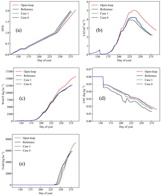 Effects of nitrogen observation on the ORYZA-EnKF data assimilation system. (a–e) represent the simulation results for DVS, LAI, WAGT, LNC, and yield, respectively. The black dots and lines refer to OSS observations; the red lines are open-loop simulation results; the green line in Case 1 is the simulation result of all observed variables, and the blue line in Case 6 represents the result of removing the observation of leaf nitrogen content from all observed variables.