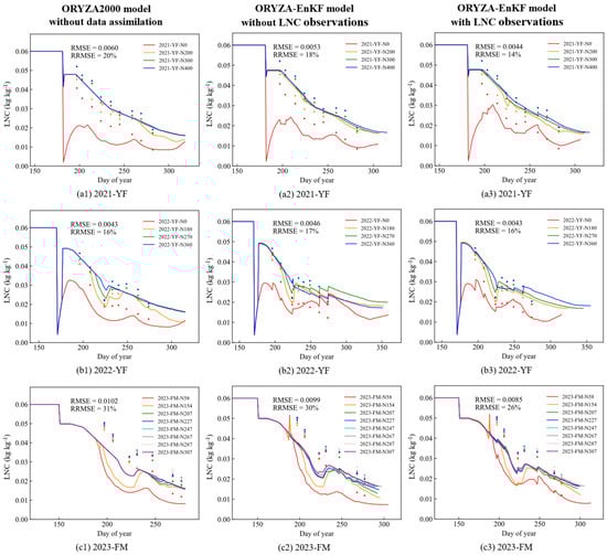 Simulation of rice LNC by the ORYZA-EnKF data assimilation system. The legend is labeled with year + test field location + nitrogen application level. (a1–a3) 2021-YF; (b1–b3) 2022-YF; (c1–c3) 2023-FM.