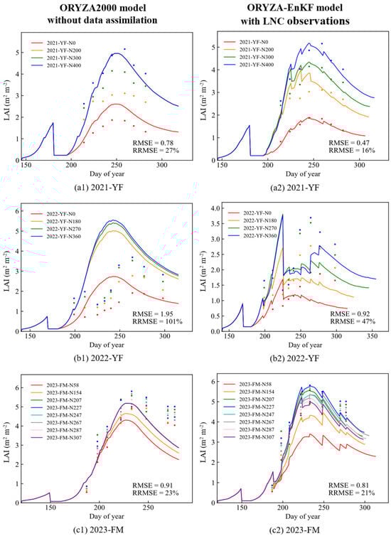 Simulation of the rice LAI by the ORYZA-EnKF data assimilation system. The legend is labeled with year + test field location + nitrogen application level. (a1,a2) 2021-YF; (b1,b2) 2022-YF; (c1,c2) 2023-FM.