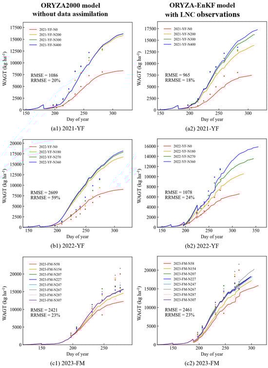 Simulation of WAGT by the ORYZA-EnKF data assimilation system. The legend is labeled with year + test field location + nitrogen application level. (a1,a2) 2021-YF; (b1,b2) 2022-YF; (c1,c2) 2023-FM.