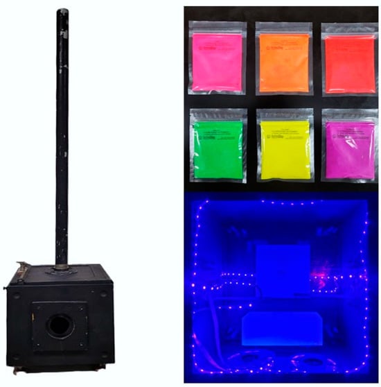 (Left): custom-constructed apparatus to estimate settlement velocity of small particles in ambient air (tube length = 99 cm × 5.7 cm diameter pipe, chamber = 25.5 cm × 30.5 cm × 30.5 cm). (Upper right): example of some TechnoGlow™~5–50 µm UV fluorescent particle colors. (Bottom right): inside view of the apparatus chamber lined with long-wave UV LED light strip tape turned on.