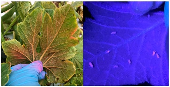 In the last week of September and first week of October in 2022, we selected multiple-source squash plants in an experimental set of plantings at the University of Georgia—Tifton Campus Experiment Station to field mark and capture dispersing whiteflies on 15 cm × 8 cm yellow sticky card traps. Between 9:00 a.m. and 12:00 p.m., on two separate days one week apart (22 °C–26 °C, 65–80% relative humidity), we arbitrarily selected 2 and 3 whitefly-infested source plants within a row of squash plants and used a cordless, USB rechargeable airbrush loaded with a mixture of 0.8 g of pink, fluorescent UV particles in 1.5 mL of 10% ethanol to coat the underside of two leaves containing from ~100 to 450 adult whiteflies in total (Figure 2). Source plants were separated by 4 planting rows, ~7 m, and were separated by at least 10 m up or down the planting rows from each other to reduce potential cross contamination between the source plants. The UV particle mixture was applied as uniformly as possible to the underside of the infested leaves (Figure 2). Once the application was finished for each leaf (<1 min per leaf), the leaves were returned to their natural resting position. We did not observe the whiteflies dispersing from the plants during the marking process or within the 15 min following application. This was possibly due to the application occurring in the morning when the temperatures were relatively cool with unfavorable whitefly flight conditions. We positioned four yellow sticky card traps (10 cm × 18 cm) at 0 m, 1 m, 2 m, 3 m, and 4 m distances from the source plants along two directions up and down rows. Sticky cards were positioned from metal stands positioned ~0.46 m inches off the ground but above the outer margins of the squash leaf canopy. The sticky card at 0 m was placed over the top of the two leaves where the whiteflies were marked. We left the sticky cards in the field for 2 days, after which we counted the number of marked whiteflies with a dissecting scope and a hand-held UV LED flashlight as a light source (Figure 3). Any whitefly with a detectable UV particle was counted as a marked individual. We plotted the marked whitefly counts versus the distance from the source plants and overlaid the individual dispersal gradients, both up rows and down rows, onto the same figure. If the field marking technique is reasonably successful and potentially useful, we should observe the marked whiteflies to form a dispersal gradient from the source plants (e.g., decreasing marked whitefly counts with increasing distance from the source).