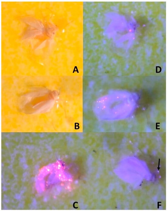 Images of whiteflies (Bemisia tabaci) with UV particles attached on the yellow sticky cards. Image pairs (A/D) and (B/E) are the same individuals under normal light (A,B) and long-wave UV LED-generated light (D,E). Images (C,F) represent the extremes of particle adhesion with many attached particles (C) or one particle attached to an antenna (black arrow (F)).