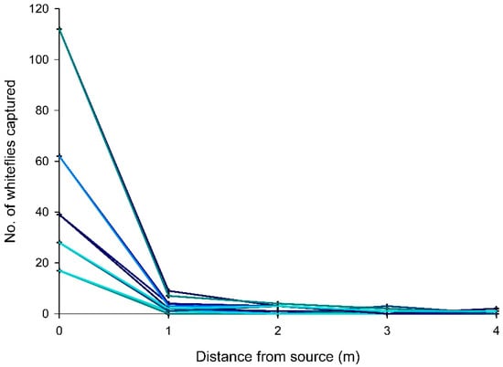 We field marked the whiteflies either resting or feeding on the underside of two infested squash leaves from five different source plants. After two days, a proportion of the marked individuals were trapped on sticky card traps up to 4 m, demonstrating the dispersal of marked individuals (Figure 4). The number of captured individuals was occasionally high when the sticky card was positioned over the source leaves (0 m), >100 marked individuals in some instances, and we observed a decrease in trap efficiency with increasing distance from the source plants (Figure 4). These sticky card counts of marked whiteflies generated a dispersal gradient, which appeared consistently between the replicate source plants (Figure 4).