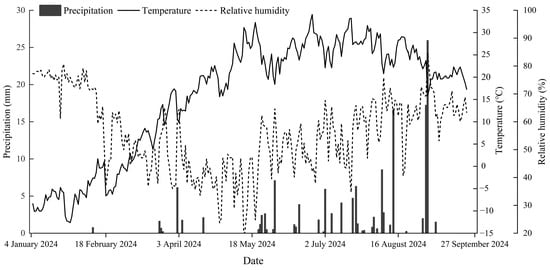 The experimental site is located in Company 10, 29th Regiment in Korla City, Xinjiang, characterized by drought and low rainfall, and belongs to a temperate continental arid climate. The annual average temperature is 11.4 °C, the annual average rainfall is 58.6 mm, the annual average evaporation is 2700 mm, the annual sunshine duration is 2990 h, and the annual total radiation reaches 6000 mJ/m2. The soil texture is sandy loam, with an average pH of 8.13 and an average soil salt content of 13.39 g/kg at a depth of 0−40 cm, belonging to severe saline–alkali soil. The basic physical and chemical properties of the soil in the experimental site are shown in Table 1, using the ring knife method [13] to determine the soil bulk density, saturated water content, and field water holding capacity, using a LS 13 320 laser particle size analyzer (Beckman Coulter Trading Co., Ltd., Shanghai, China) to determine the soil particle size composition. The Tianqi Intelligent Ecological Station (INSENTEK Oriental Zhigan Co., Ltd., Hangzhou, China) installed in the experimental area can automatically record meteorological data such as precipitation, air temperature, and relative humidity every hour, and the meteorological data are shown in Figure 1.