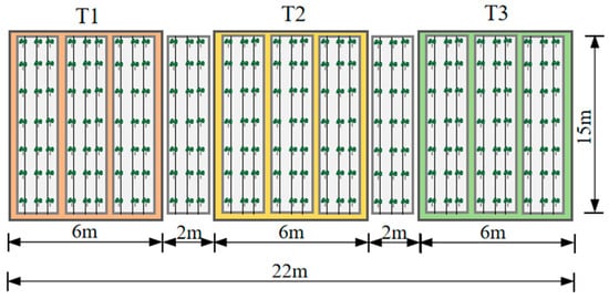 The experiment set three different amounts of irrigation water treatment, respectively, 525 m3/hm2 (T1 treatment), 675 m3/hm2 (T2 treatment), and 825 m3/hm2 (T3 treatment); a 20 mm rotary-wing water meter was used for the water measurement. Each treatment zone had a width of one membrane and a length of 15 m. Three sets of repetitions were set up, and a protective row was set up between adjacent zones. The cotton planting pattern is shown in Figure 2. The experimental layout plan is shown in Figure 3.