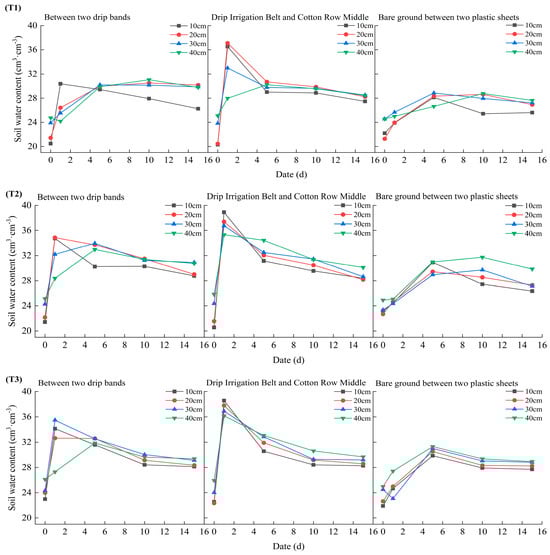 Changes in the soil water content under the different water gradients. Note: the horizontal coordinate date refers to the date after the start of irrigation; T1, T2, and T3 represent the three treatments with the irrigation amounts of 525 m3/hm2, 675 m3/hm2, and 825 m3/hm2, respectively; each processed subgraph represents, from left to right, the changes in the soil water content between two drip bands, between drip irrigation belts and cotton rows, and between bare land positions in the film.