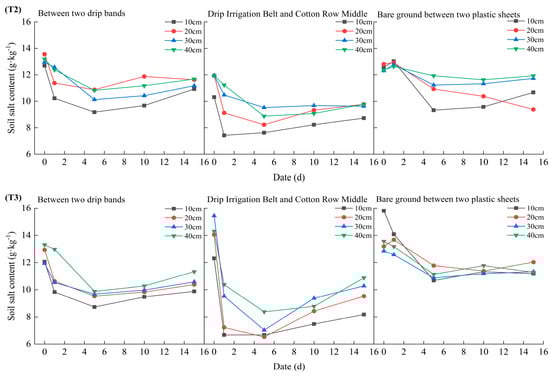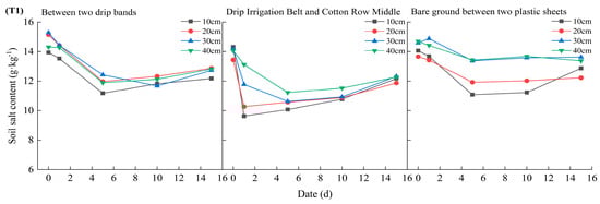 Changes in the soil salt content under the different water gradients. Note: the horizontal coordinate date refers to the date after the start of irrigation; T1, T2, and T3 represent the three treatments with irrigation amounts of 525 m3/hm2, 675 m3/hm2, and 825 m3/hm2, respectively; each processed subgraph represents, from left to right, the changes in the soil salt content between two drip bands, between drip irrigation belts and cotton rows, and between bare land positions in the film.