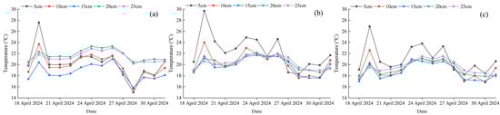 Five right-angle ground thermometers were inserted near the cotton seedlings in each treatment and observed the daily temperature changes at 5 cm, 10 cm, 15 cm, 20 cm, and 25 cm below the surface of the ground; the observation time was from 11:30 to 12:00 every day.