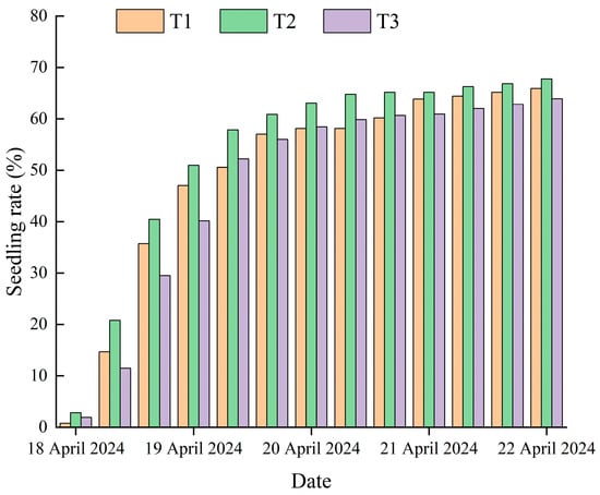 The optimal temperature for cotton seed germination is 18–22 °C [16], and too low a temperature will lead to difficulties in cotton seedling emergence, increase the risk of seed erosion by pathogens, and affect the germination and later growth of cotton seeds. In addition, too high a soil water content will increase the degree of soil compaction, increase soil density, and reduce soil permeability, which is also unfavorable to the growth of the seed root system [30].